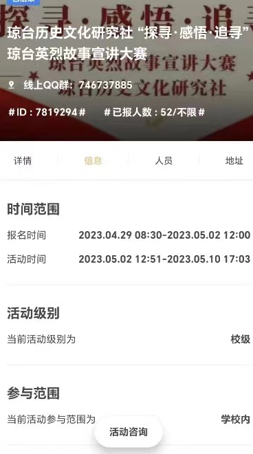 传统文化之境,折射博大精深,琼台历史文化渊源悠扬,似汪洋般承载着琼崖红,无数伟人曾立于琼崖之巅,革命的热血沸腾于汪洋,烬燃于火光之中。为了弘扬琼台历史革命文化、缅怀琼台英烈,激励同学们努力奋斗、弘扬烈士精神。我社于2023年5月2日至10日举办了“探寻感悟·追寻”琼台英烈故事宣讲大赛活动,下面就跟着小博一起去看看活动回顾吧!