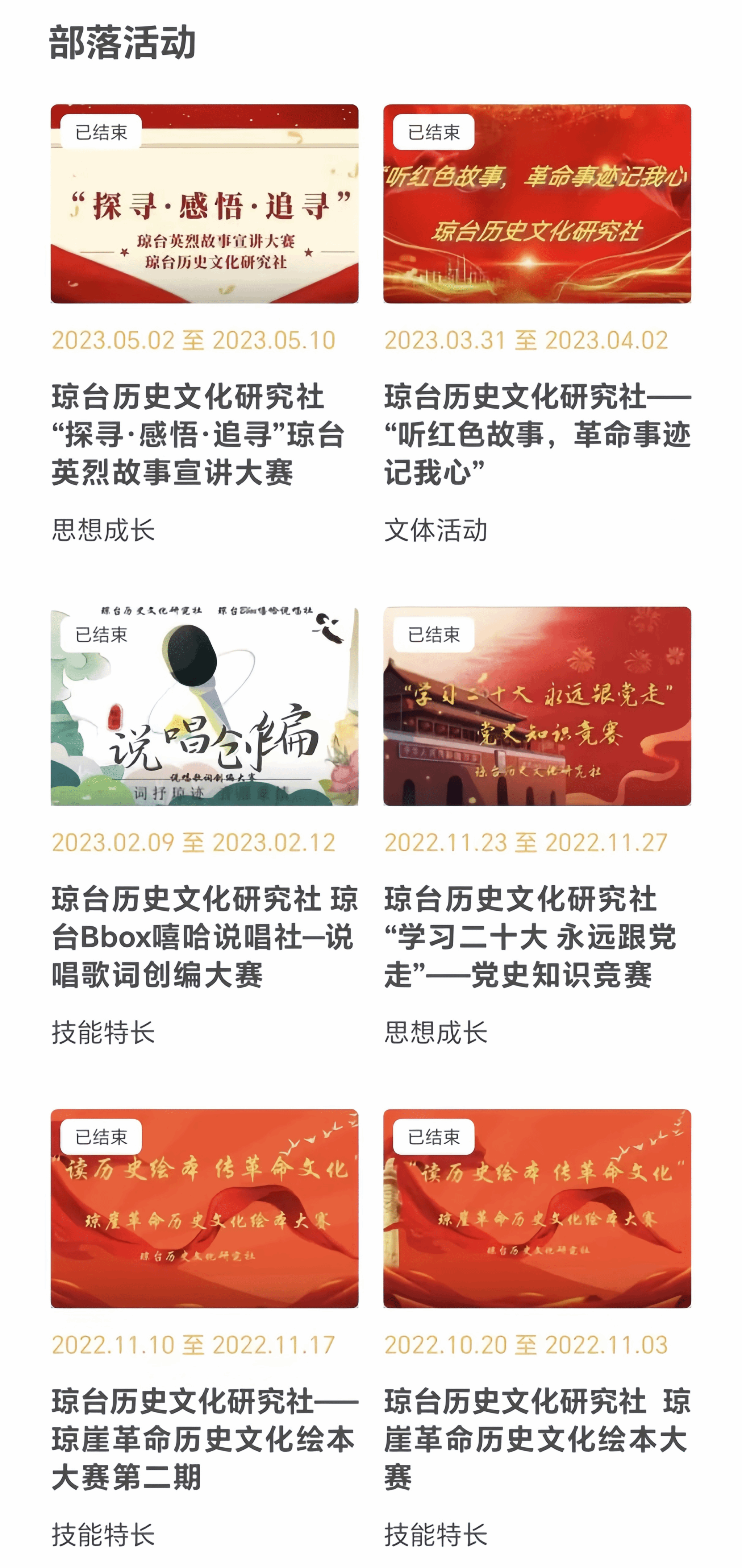 琼台历史文化研究社定期举办相关活动,社员可优先报名,参与活动获得相应学分。我们组织报名参加校级、省级活动,大大丰富社员的校园文化生活,对综测、评优都有帮助噢!