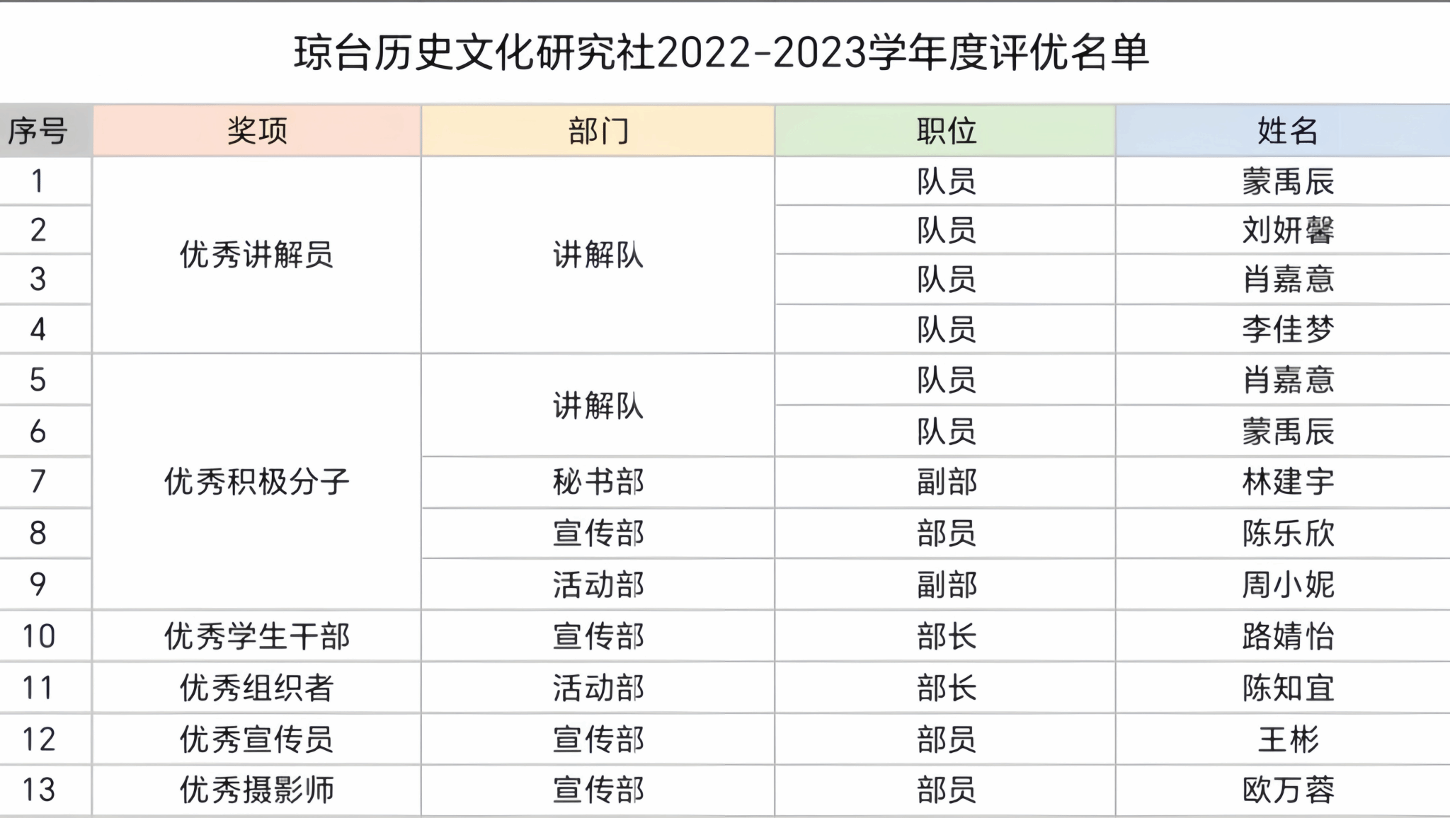 ②正副社长、各部门正副部长:任期满一年可获得相应职位的聘书。③社团内部每一学年都会进行“社团评优”,根据所填报的申报表、工作能力等情况进行综合测评,测评优秀者将授予“优秀积极分子、优秀学生干部”等优秀称号。