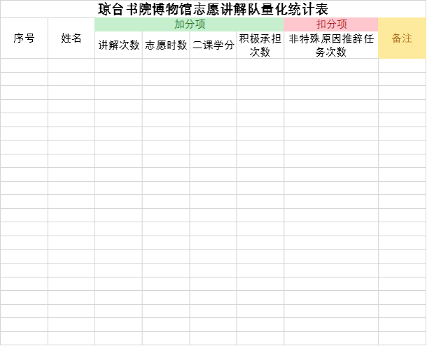 5.依据一学年以来志愿讲解队的量化统计表(见附件1),按质按量完成任务的志愿讲解员根据工作实际给予相应的二课学分和志愿者时长。