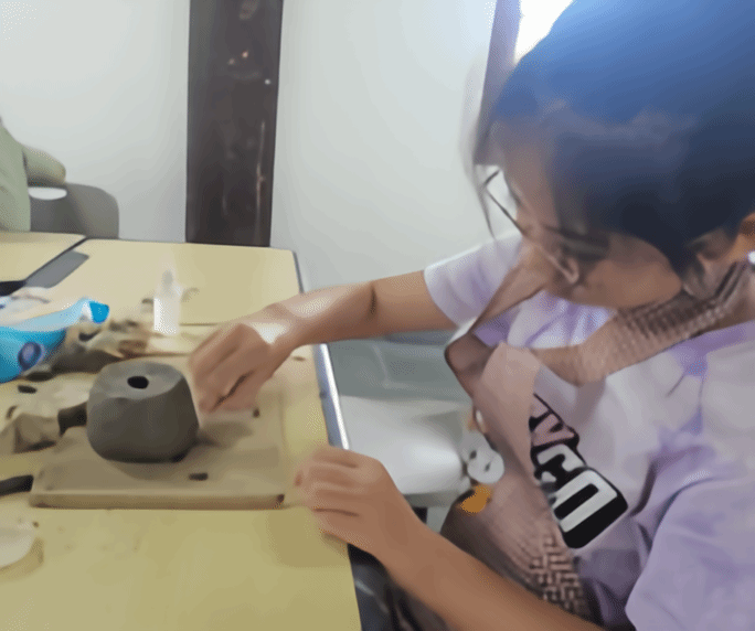 孩子们则围坐在老师身边,他们的眼睛里充满了好奇和渴望,紧紧盯着师傅们的每一个动作,生怕错过任何一个精彩瞬间。当轮到他们自己动手时,孩子们兴奋不已,迫不及待地抓起泥土,开始了自己的创作之旅。他们用稚嫩的小手努力地揉搓着泥士,试图将自己心中的想象化为现实。每一个孩子都沉浸在创作的快乐中,他们的脸上洋溢着纯真的笑容,那是对艺术最纯粹的热爱和追求。