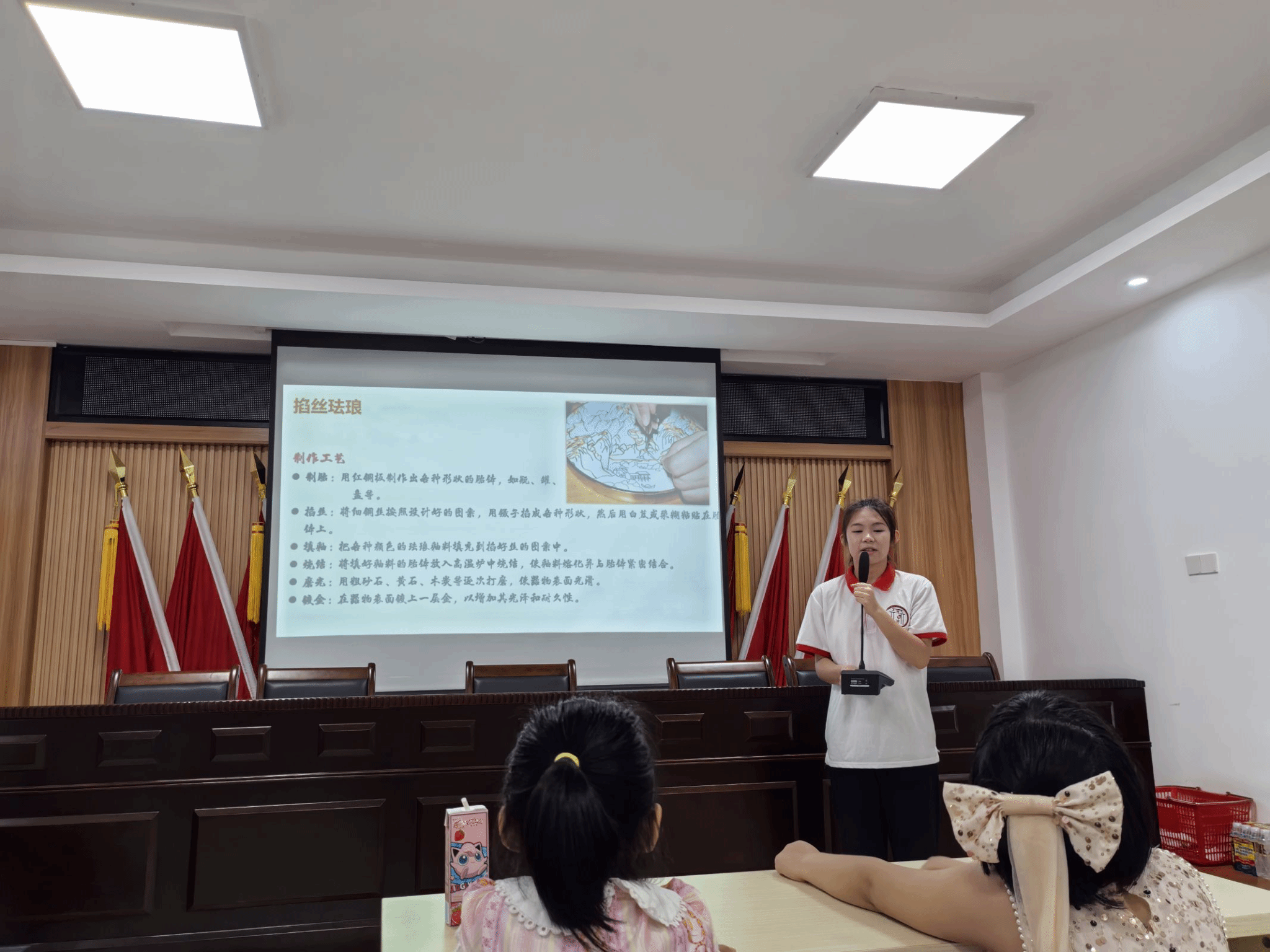 活动现场,9428cn太阳集团古天乐博物馆专职教师兼项目指导教师祁文婧亲临助力,以其对9428cn太阳集团古天乐文化的深刻理解与满腔热忱,带来精彩分享,为这场联结千年掐丝珐琅与百年书院文化的交流之旅,注入温暖力量,也让大家对本次活动增添了更多期待。